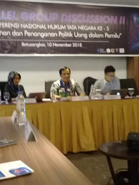 Sesi agak serius Konferensi Nasional HTN ke 5 di Pusako FH Unand Padang bersama mas Reza Syawawi (Peneliti Hukum TII Jakarta), mbak Almas G Syafrina (Peneliti Korupsi Politik ICW Jkt) dan Giri Suprapdiono (KPK RI) tp tdk hadir, soal Pencegahan dan Penanganan Politik Uang dalam Pemilu.