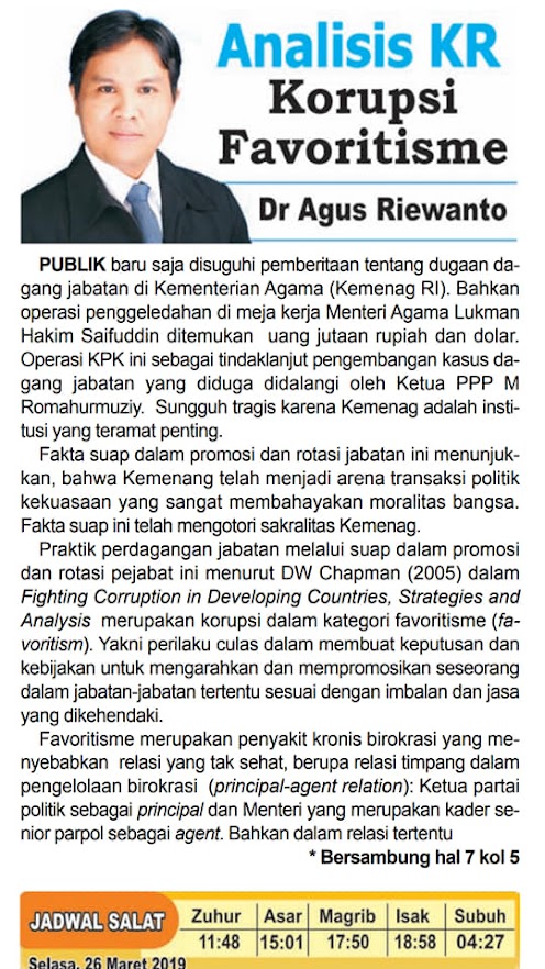 Analisis saya hari ini, Selasa, 26 Maret 2019, mewaspadai penyakit kronis birokrasi: “Korupsi Favoritisme”, yakni mempromosikan jabatan dan kebijakan dng imbalan jasa. Mengakibatkan relasi timpang prinsiple-agent dalam birokrasi.