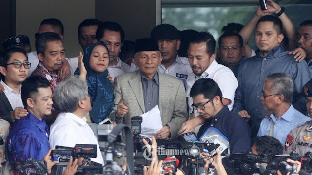 Ketua Dewan Kehormatan Partai Amanat Nasional (PAN) Amien Rais saat memberikan keterangan pers sebelum Gedung Polda Metro Jaya, Jakarta Pusat, Rabu (10/10/2018). Kedatangan Amien Rais[…]