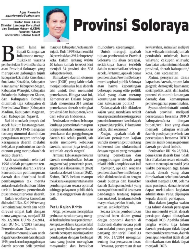 Belum lama ini Bupati Karanganyar Juliatmono mengemukakan wacana pembentukan Provinsi Surakarta atau Provinsi Soloraya yang merupakan gabungan tujuh kabupaten/kota eks Karisedanan Surakarta.(Kota Solo, Kabupaten Karanganyar, Kabupaten Sragen, Kabupaten Wonogori, Kabupaten Sukoharjo, Kabupaten Klaten, dan Kabupaten Boyolali) ditambah lagi tiga kabupaten di Propinsi Jawa Timur (Kabupaten Madiun, Kabupaten Magetan, dan Kabupaten Ngawi).