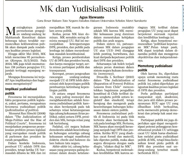 Kolom Kompas, Kamis, 19 Juni 2025 mengkonfirmas fenomena “Yudisialisai Politik” pergeseran penentu penyelesain problem cacat formil dan materil UU dalam legislasi di Indonesia dari ranah DPR dan Presiden ke ranah pengadilan.