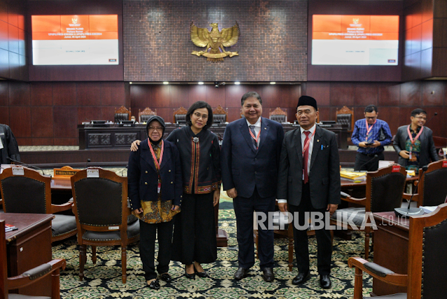 Menko PMK Muhadjir Effendy (kanan), Menko Perekonomian Airlangga Hartarto (kedua kanan), Menteri Keuangan Sri Mulyani (kedua kiri) dan Menteri Sosial Tri Rismaharini (kiri) berfoto bersama[…]