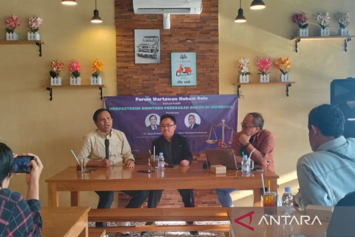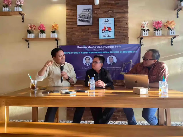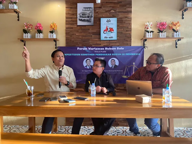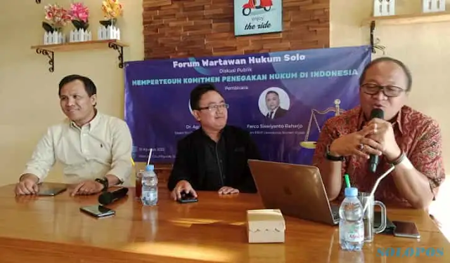 Pakar hukum tata negara UNS, Agus Riewanto (kiri) dalam Diskusi Hukum bertema 'Memperteguh Komitmen Penegakkan Hukum di Indonesia: Membedah Konstruksi Peraturan Presiden Nomor 28 Tahun[…]