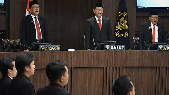 Ketua Dewan Kehormatan Penyelenggara Pemilu (DKPP) Heddy Lugito (tengah) didampingi jajaran anggota DKPP lainnya menyanyikan lagu Bagimu Negeri usai membacakan vonis terhadap Ketua KPU Hasyim[…]