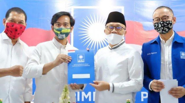 Ketua Umum PAN Zulkifli Hasan dan putra sulung Presiden Jokowi Gibran Rakabuming Raka menyerahkan surat rekomendasi untuk Pilkada Solo 2020 di Jakarta, Rabu (12/8/2020).