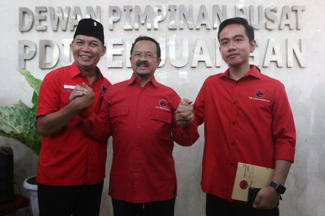 Indonesian Democratic Party of Struggle (PDI-P) politicians Teguh Prakosa (right), Achmad Purnomo (center) and Gibran Rakabuming Raka make a joint appearance after undergoing screening at[…]